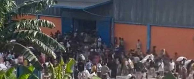 Dalam situasi tersebut, massa mendobrak pagar, merusak gembok gudang, lalu mengambil persediaan beras dan minyak goreng. Aparat keamanan yang ada di lokasi berupaya melakukan pencegahan, tetapi tidak mampu membendung massa yang bergerak karena kebutuhan pangan yang mendesak akibat bencana.